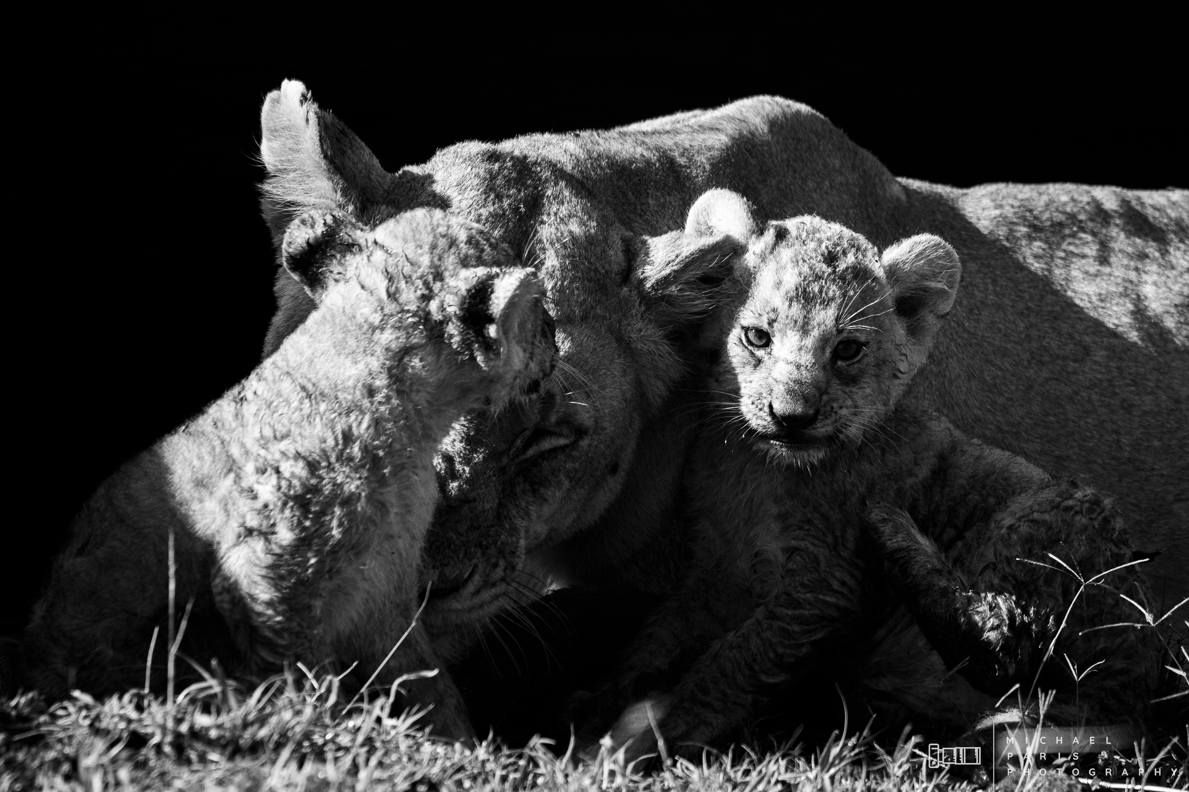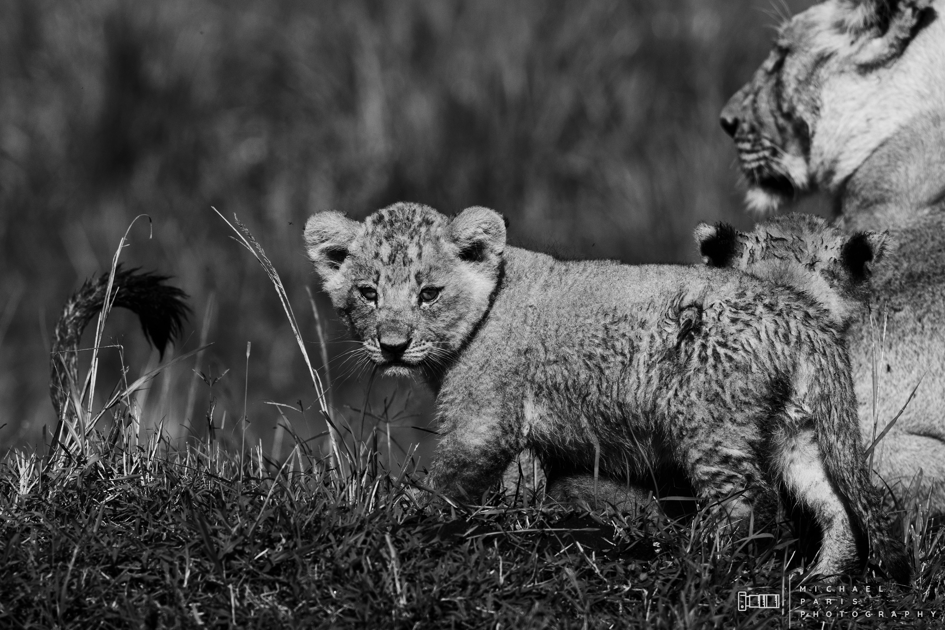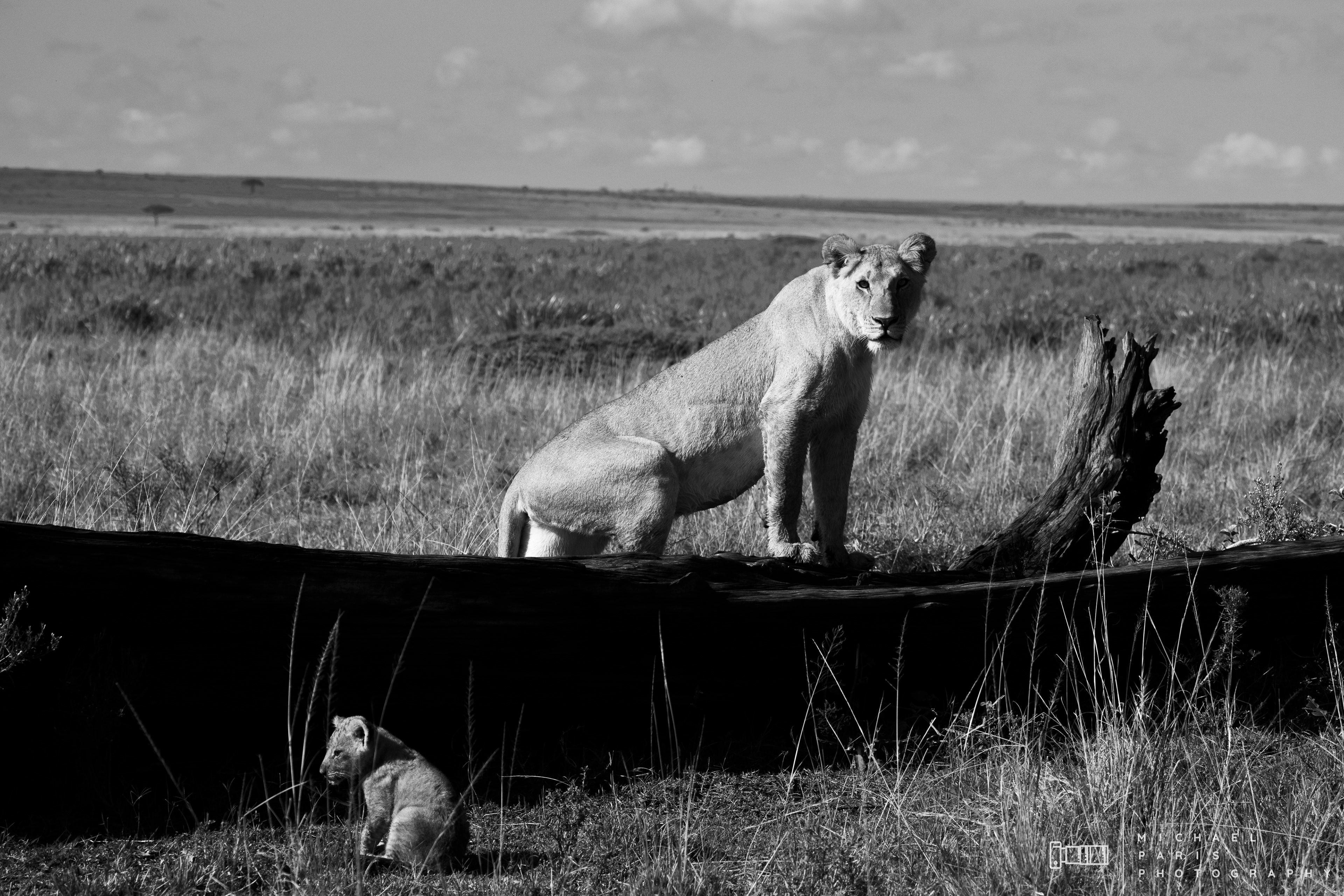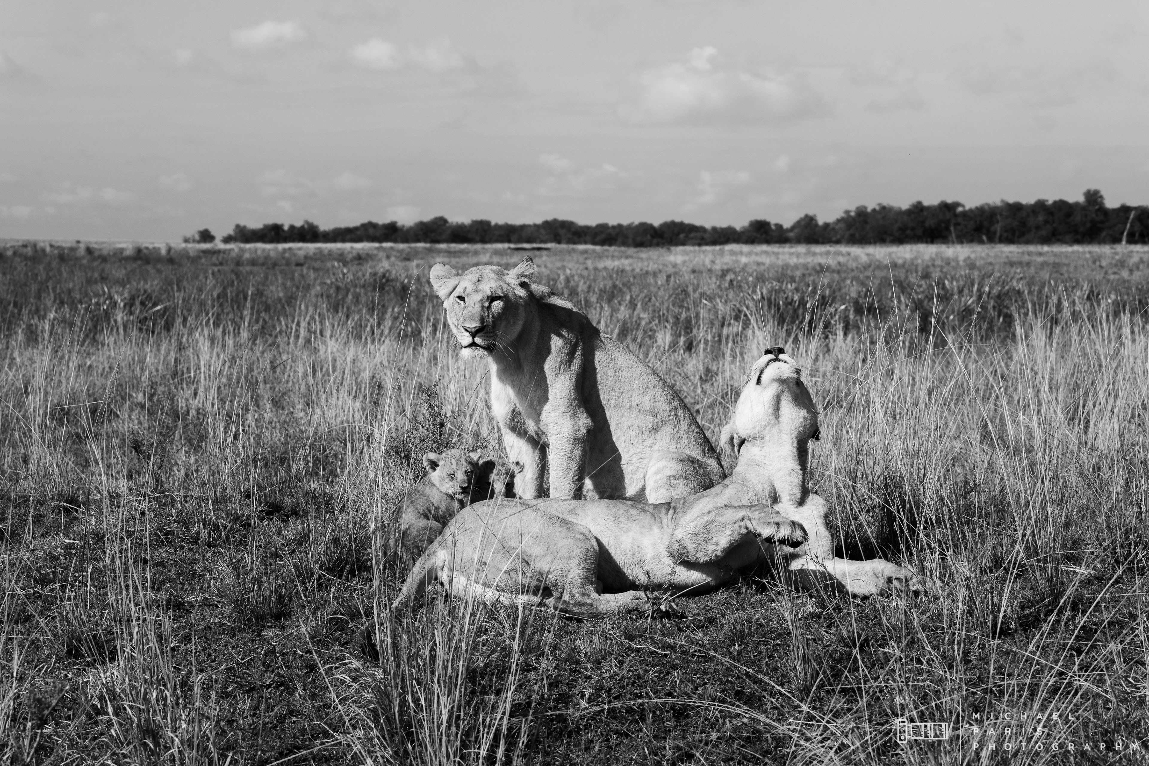 Two lionesses guide two young cubs through a marshland after an intense rainfall event. The lions take shelter from the morning sun next to a fallen tree, where the cubs are cleaned and play with their mother.