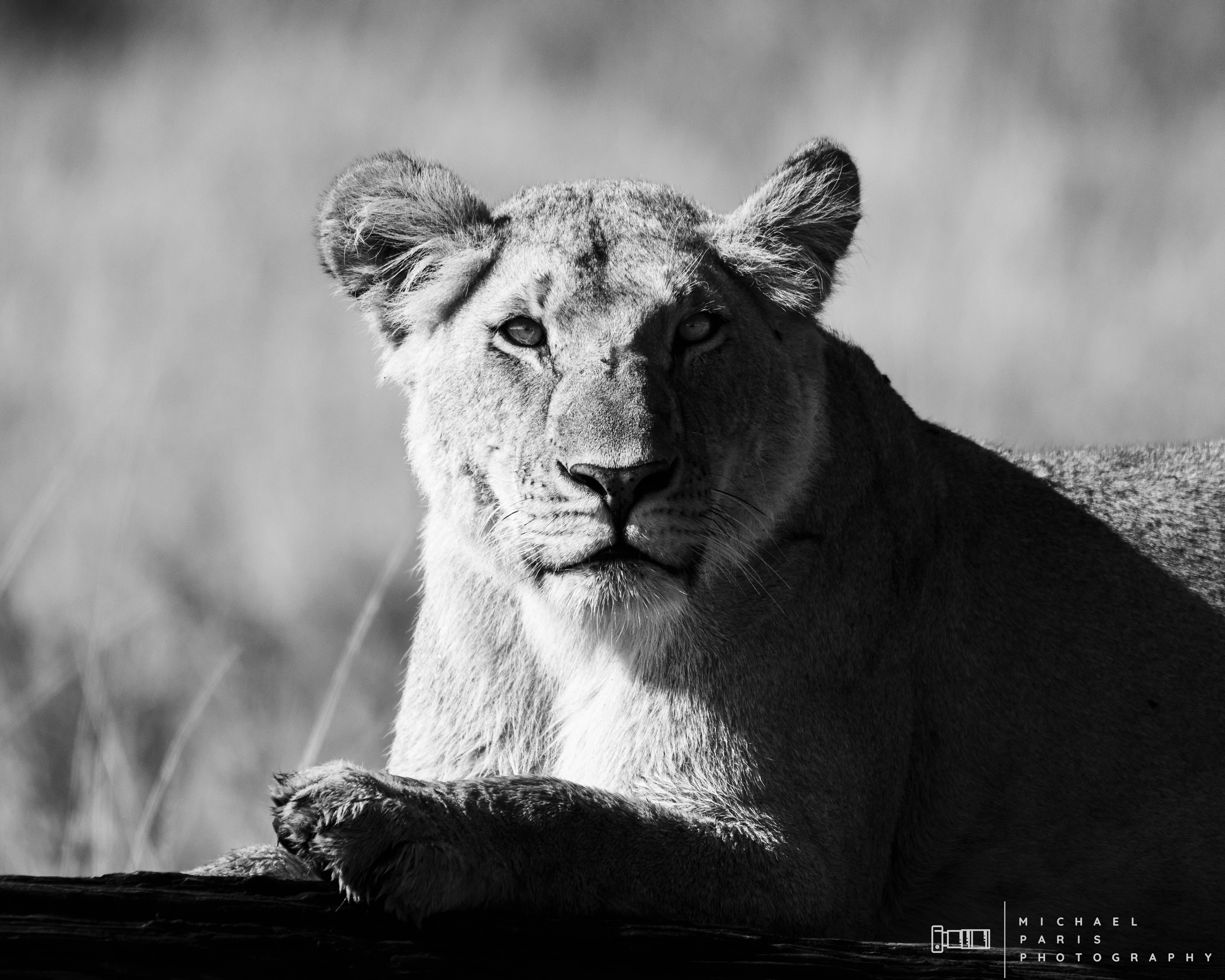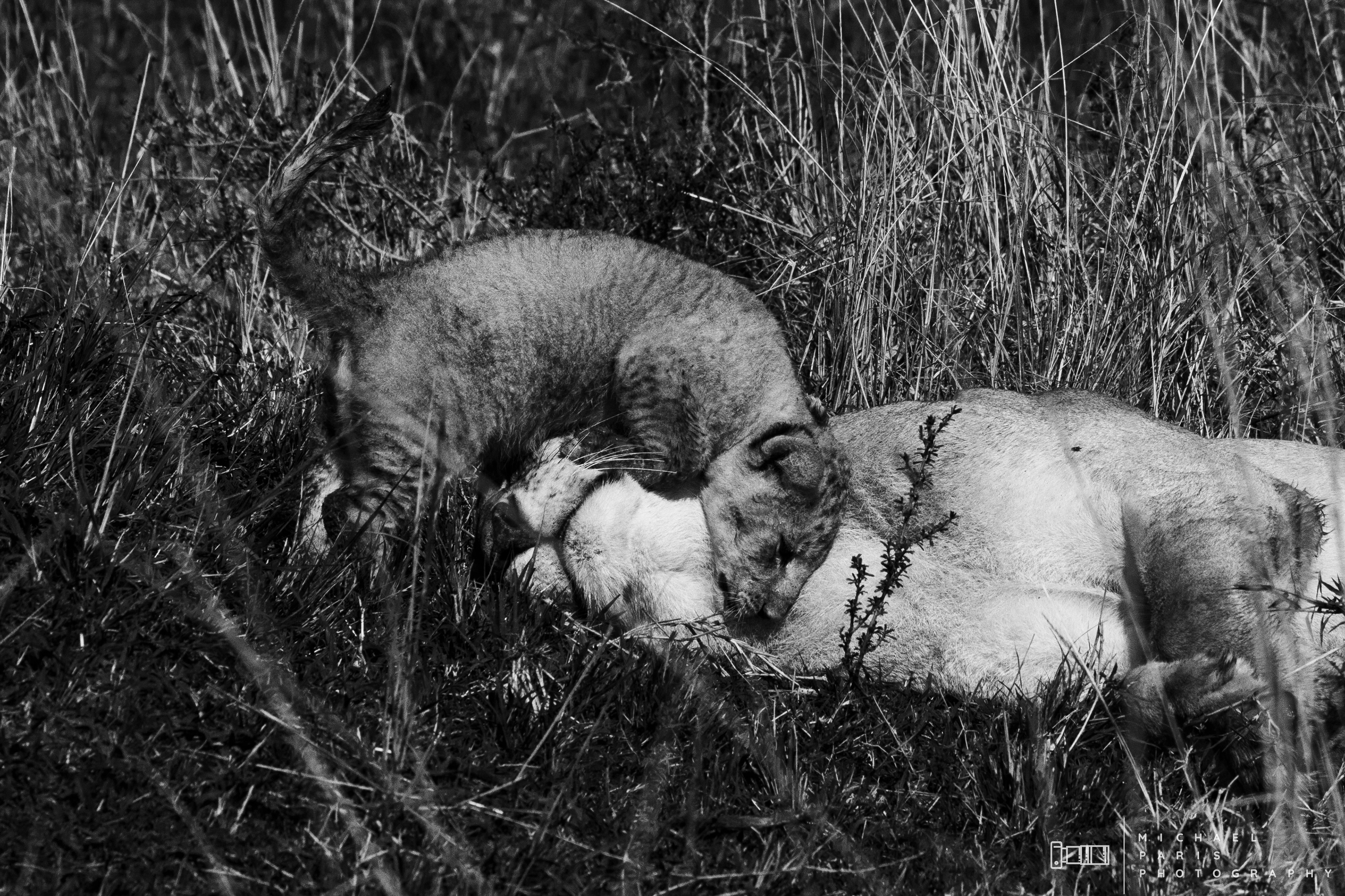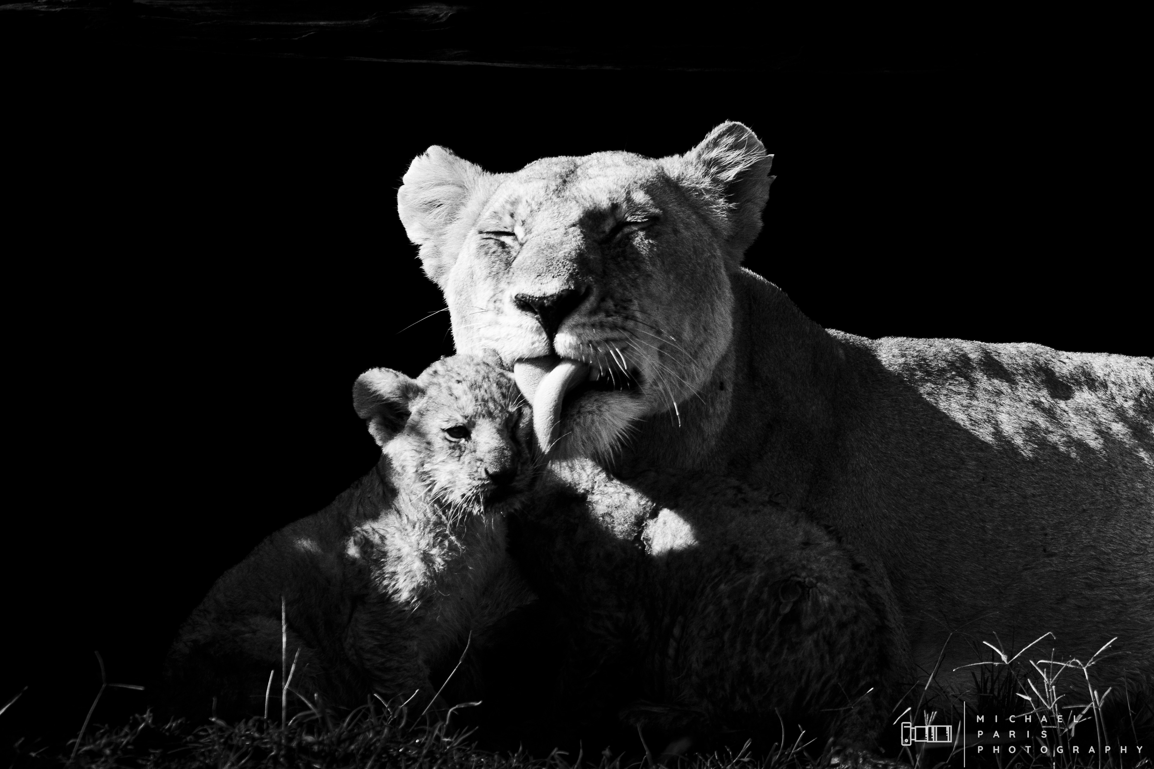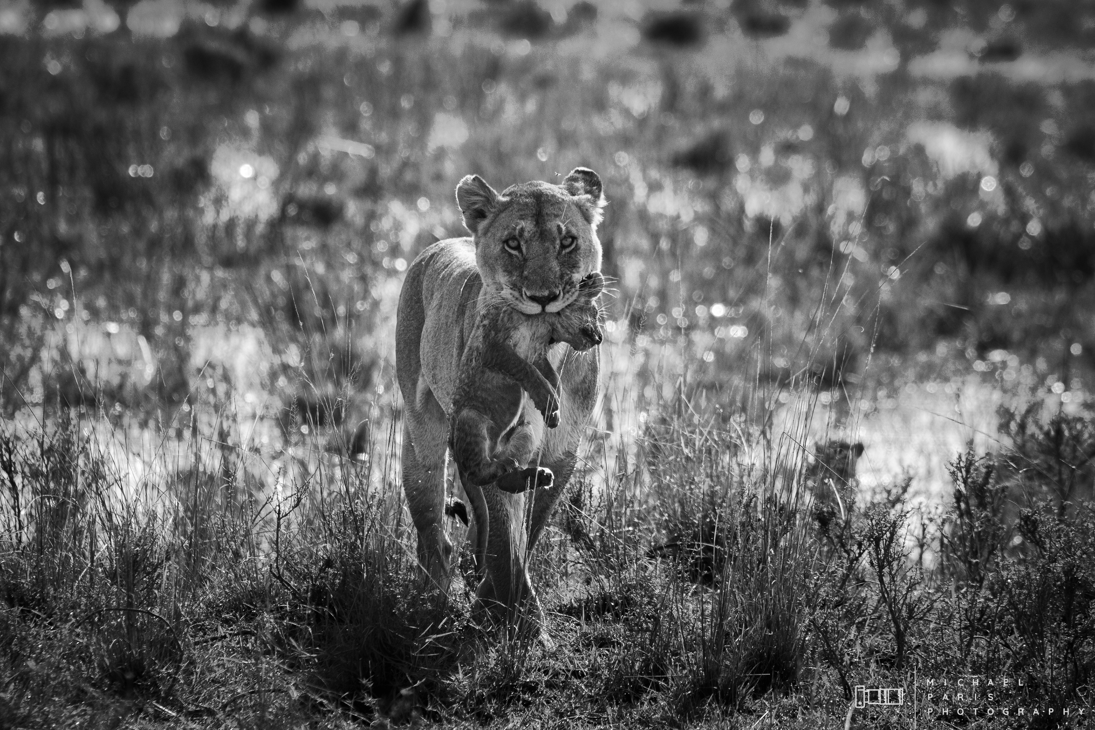 Two lionesses guide two young cubs through a marshland after an intense rainfall event. The lions take shelter from the morning sun next to a fallen tree, where the cubs are cleaned and play with their mother.
